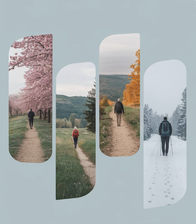 - 봄: 신록과 야생화가 가득한 산길에서 봄의 기운을 느낄 수 있습니다.