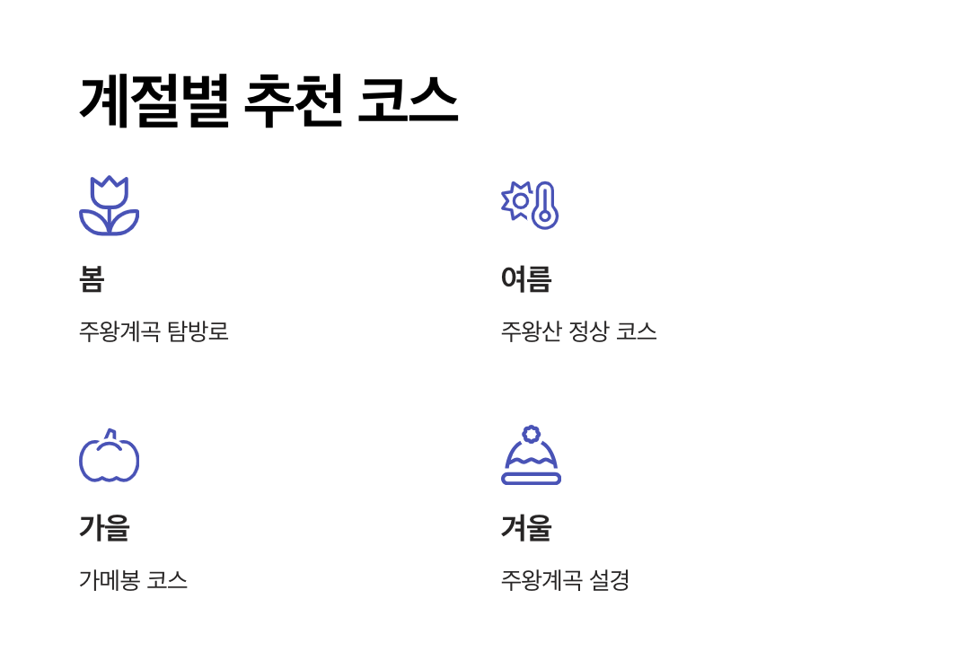 봄철에는 주왕계곡 탐방로가 가장 추천됩니다. 신록이 우거진 계곡 주변에는 수달래와 같은 야생화가 만개해 걷는 내내 상쾌함을 느낄 수 있습니다. 경사가 완만해 초보자도 부담 없이 산행을 즐길 수 있으며, 기암괴석과 푸른 자연의 조화가 봄 산행의 매력을 극대화합니다.