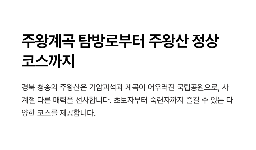 | 1. 국립공원공단 주왕산 탐방 정보 | 주왕산 국립공원의 탐방로 지도, 명소, 계절별 추천 코스 등 유용한 정보를 제공합니다. 등산 전 최신 정보를 확인할 수 있는 공식 웹사이트입니다. |