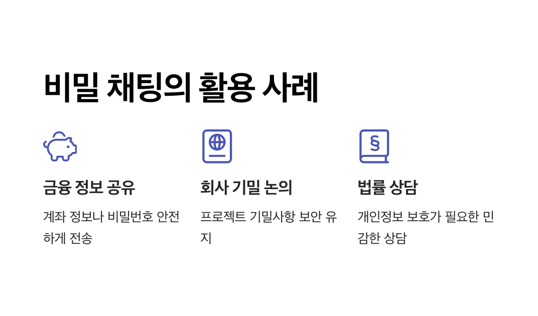 비밀 채팅은 보안이 중요한 금융 정보 공유, 회사 내부 기밀 대화, 법률 및 의료 상담 등에서 특히 유용하게 사용할 수 있습니다.