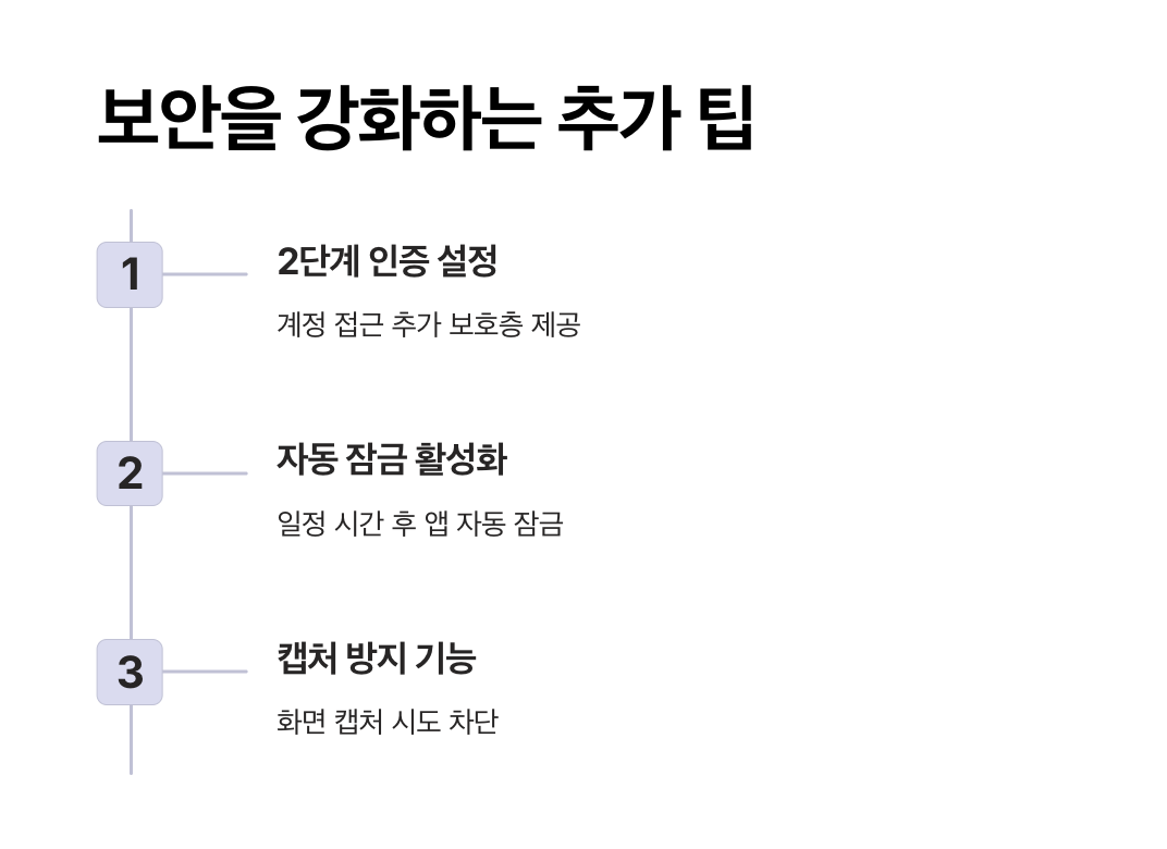 - 2단계 인증 설정, 자동 잠금 활성화, 캡처 방지 기능 사용, 정기적인 로그인 기록 확인 등 추가적인 보안 조치를 병행하는 것이 중요합니다.