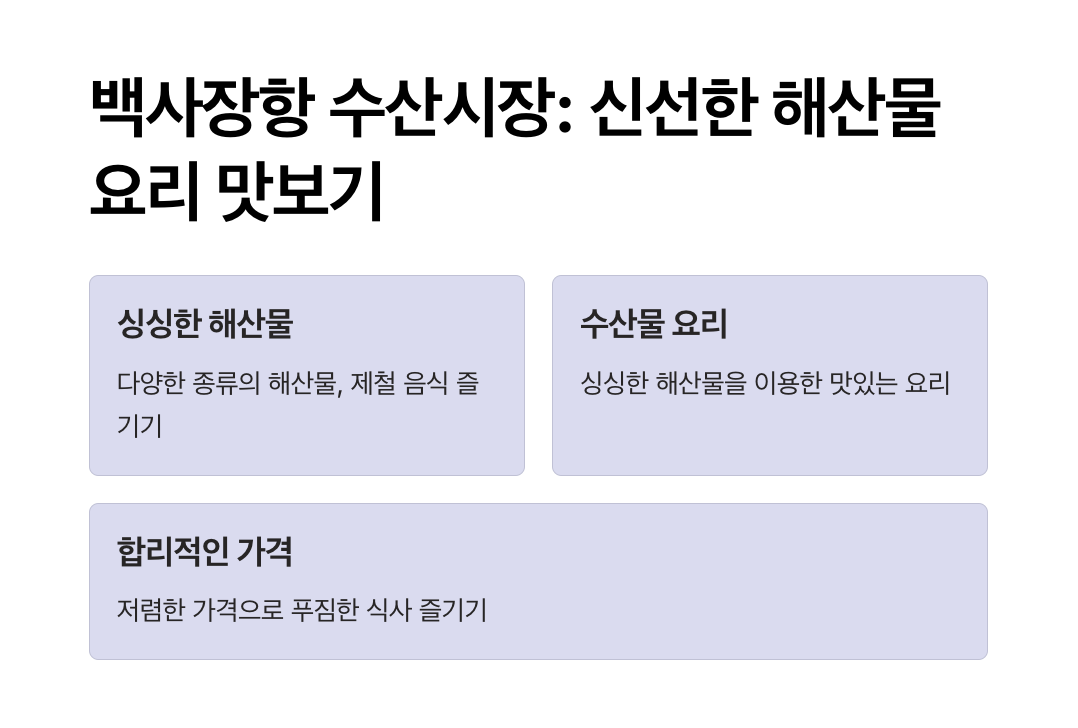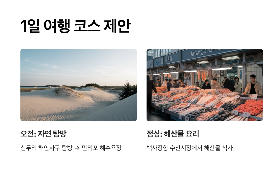- 점심: 백사장항 수산시장에서 신선한 해산물로 점심 식사