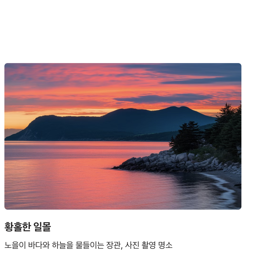 특징: 꽃지해변은 서해안 최고의 낙조 명소로, 할미·할아비 바위 사이로 지는 일몰이 압권입니다. 붉게 물드는 석양 아래 사진을 찍으면 잊지 못할 추억을 남길 수 있습니다.