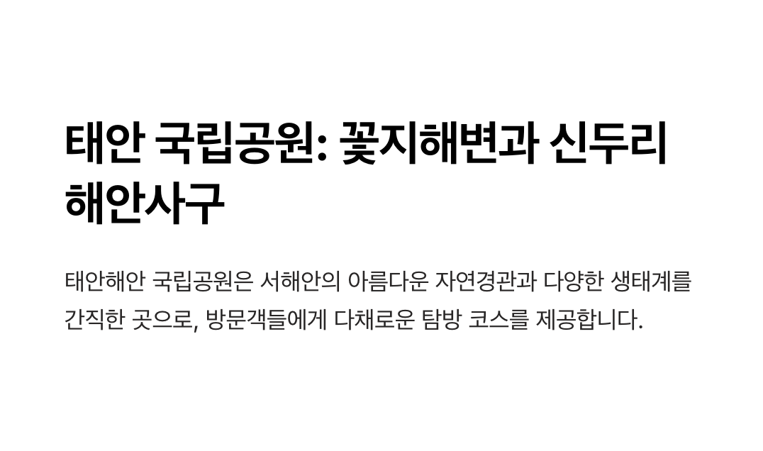 | 1. 국립공원공단 태안해안 국립공원 공식 홈페이지 | 태안해안 국립공원의 탐방 정보, 추천 코스, 생태 프로그램 및 주차 정보를 확인할 수 있는 공식 사이트입니다. |