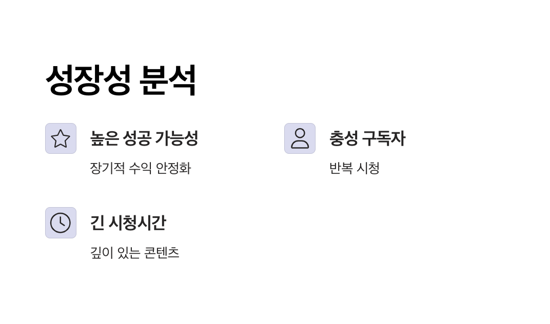 - 검색 최적화(SEO) 키워드, 썸네일 클릭률(CTR)이 성장 동력으로 작용해, 장기적으로 안정적 조회수를 확보할 수 있습니다.