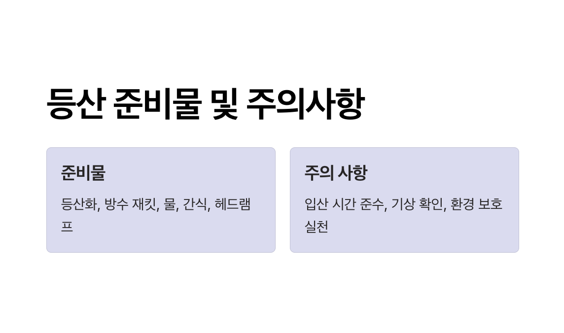 - 준비물: 물 500ml~1L, 모자, 편안한 등산화, 간단한 간식