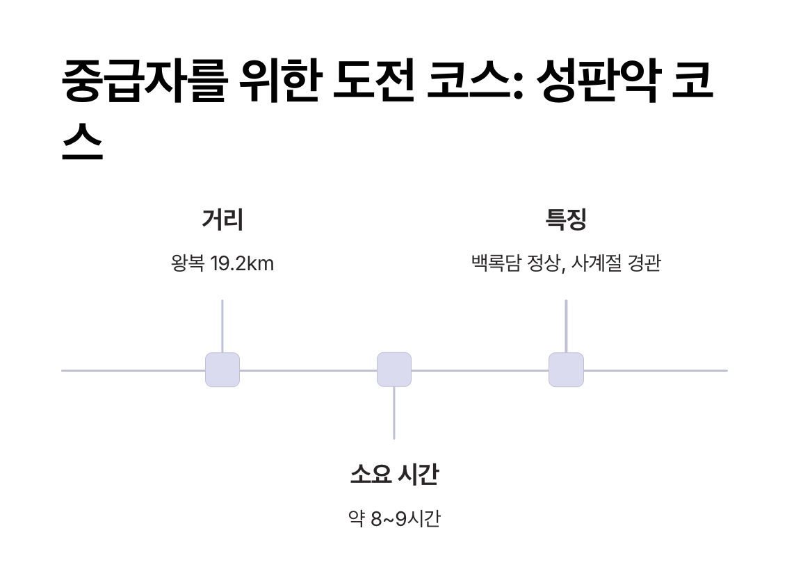 - 완만한 초반 구간과 더불어 정상 부근에서는 경사가 가팔라지는 도전적인 구간도 포함되어 있습니다.