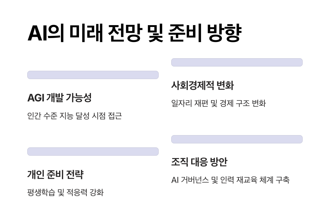 특히 AGI(범용 인공지능)의 가능성이 점점 더 논의되면서, 인간과 AI가 공존하는 방향에 대한 고민이 필요합니다. AI가 대체할 직업과 창출할 직업의 균형을 맞추는 것이 중요한 과제가 될 것입니다.