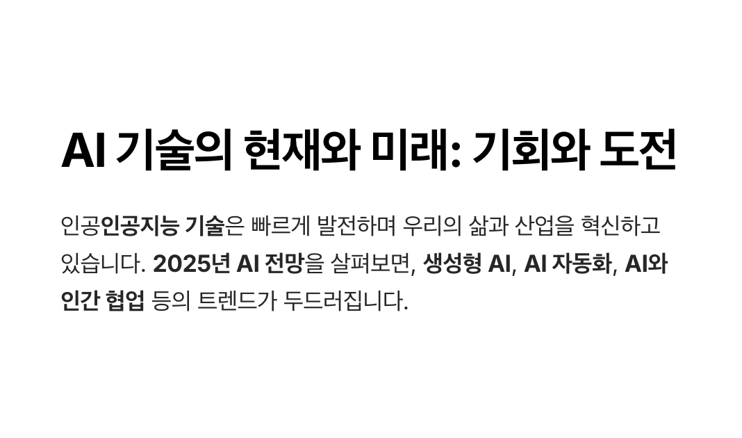 - A1. 2025년 AI 기술 발전이 가장 두드러지는 분야는 생성형 AI, 자율주행, 의료 AI, 금융 AI 등입니다. 특히 생성형 AI는 콘텐츠 제작과 마케팅, 고객 서비스 분야에서 활발히 활용되고 있으며, 의료 AI는 정밀 진단과 로봇 수술을 발전시키고 있습니다. 또한, 자율주행 AI는 교통 시스템과 스마트 도시 개발의 핵심 기술로 자리 잡고 있습니다.