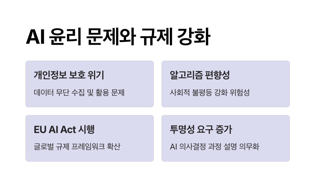 - 데이터 보호 규제: AI가 수집하는 개인정보에 대한 보호 조치 마련