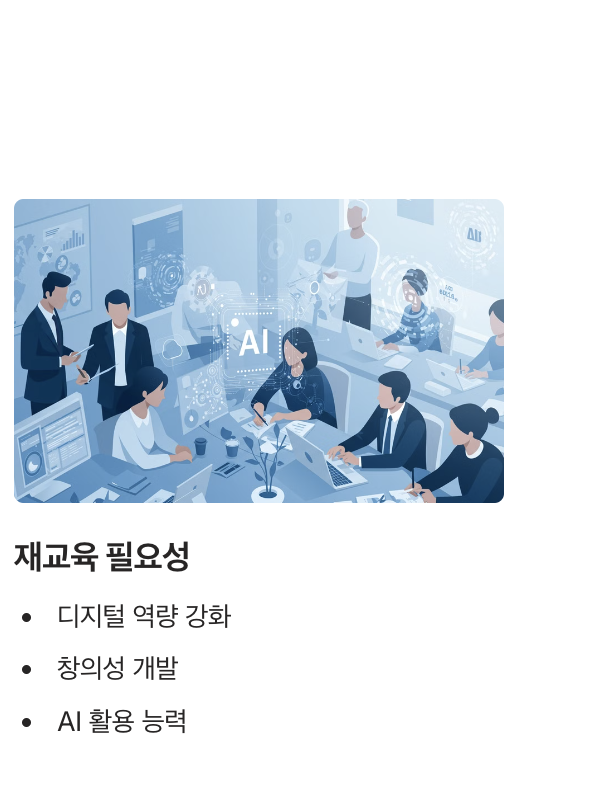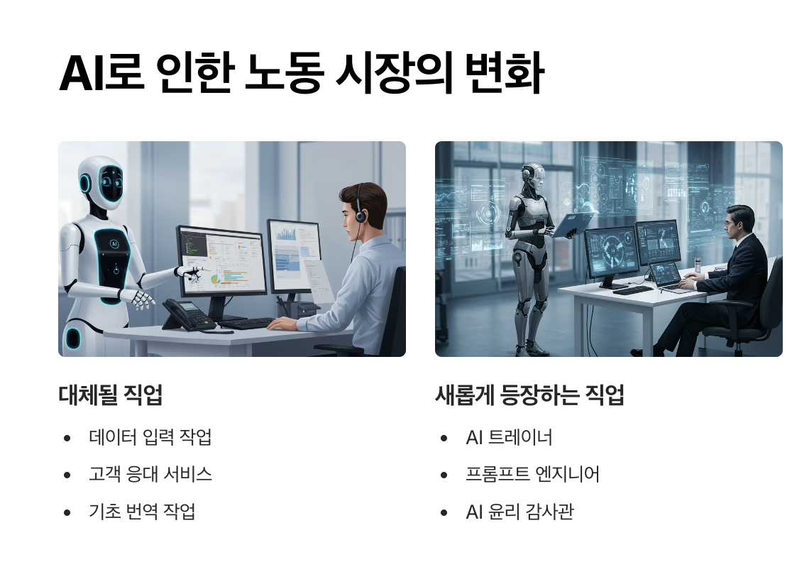AI 기술이 발전하면서 일부 직업은 자동화될 것이며, 동시에 새로운 직업과 산업이 창출될 것입니다.