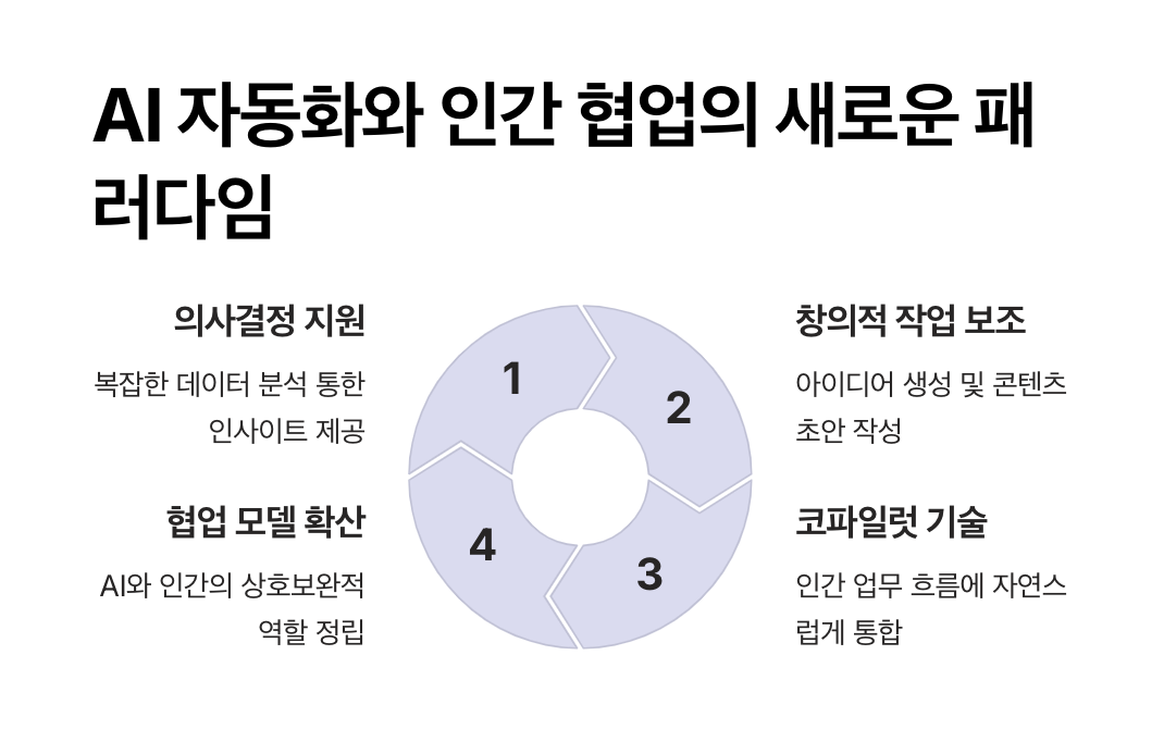 AI 기술이 단순 반복 업무를 넘어서 창의적인 업무 및 의사 결정 지원 역할까지 확대되면서, AI와 인간의 협업이 더욱 강화되고 있습니다.