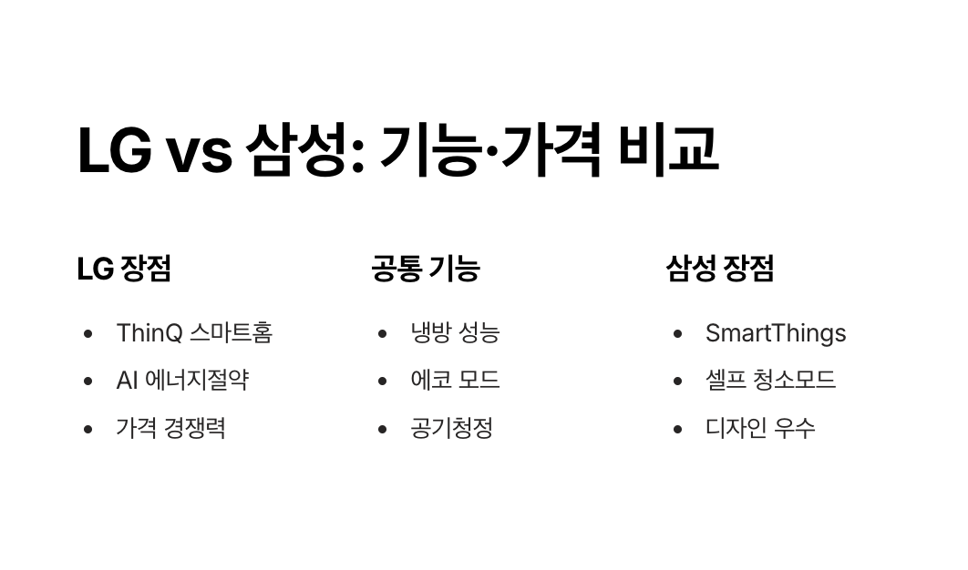 - 삼성은 AI 학습 기능과 스마트싱스 호환성이 뛰어나며, LG는 ThinQ 생태계와 멤버십 혜택이 강점입니다.