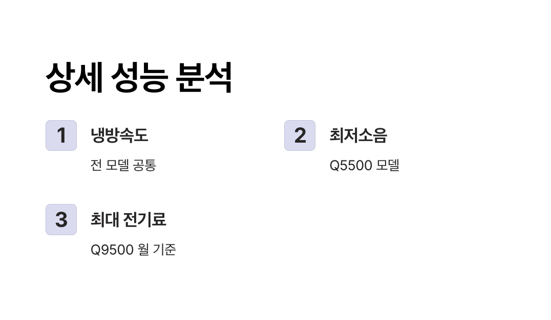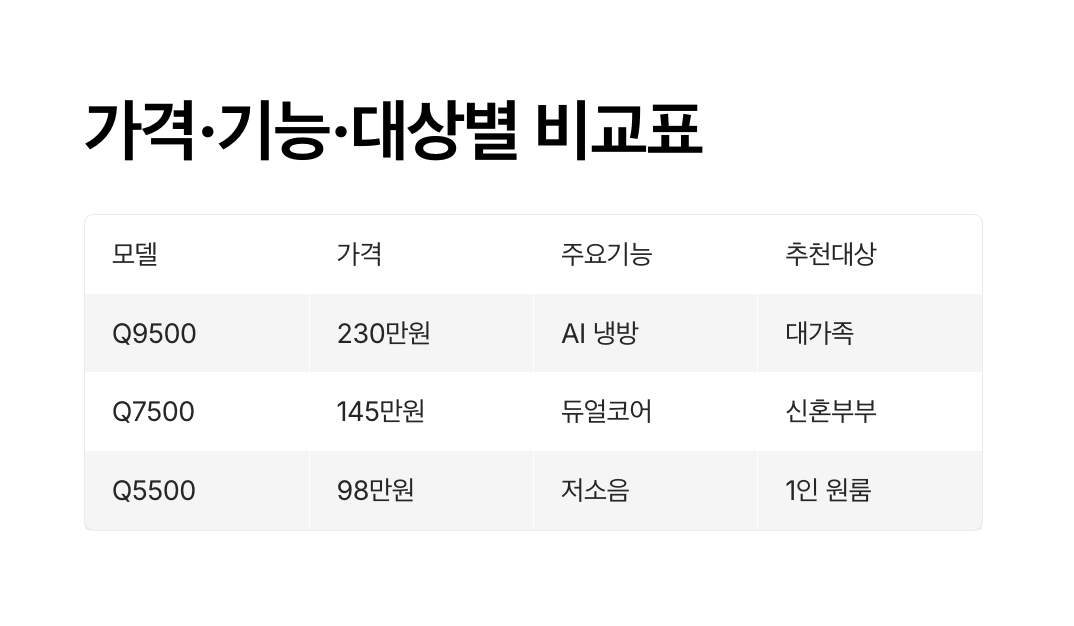 | Q9500 Premium | 2,300,000 | AI 스마트 냉방·초절전 인버터·공기청정 | 대가족·대형 거실 |