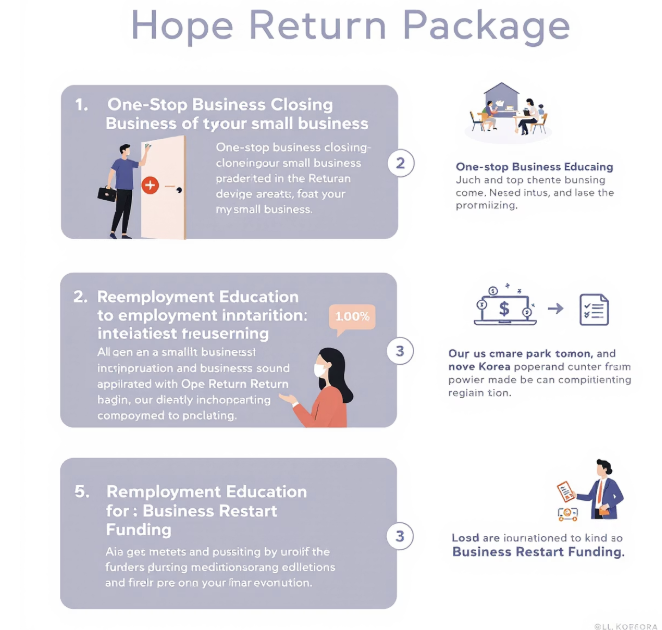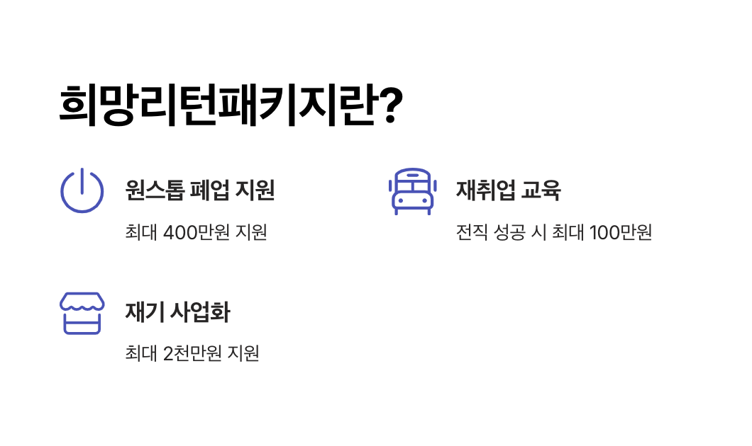 - 희망리턴패키지 재기지원: 창업 교육, 컨설팅, 초기 자금(최대 300만 원) 지원