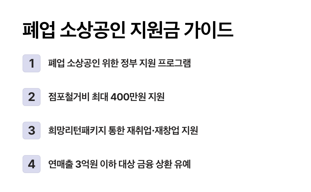 2025년 폐업 소상공인 지원금은 점포철거비, 희망리턴패키지 재기지원, 전직장려수당, 재도전 장려금 네 가지로 나뉘며, 폐업 신고일로부터 6개월 이내에 사업자등록 폐지, 소득 요건, 업종 제한을 충족해야 신청할 수 있습니다. 온라인(소진공 사이트)과 오프라인(관할 지자체·소진공 지역센터)에서 모두 신청 가능하며, 필수 서류(폐업사실증명원, 종합소득세 신고서, 주민등록등본, 통장 사본 등)를 준비해야 합니다.
