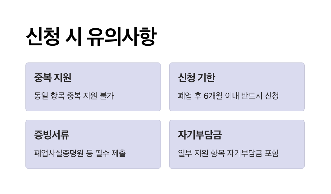 중복 신청은 동일 항목 불가하나, 다른 항목은 가능하며, 기한(점포철거비 3개월 이내, 교육 전 또는 시작 후 1개월 이내 신청)을 반드시 지켜야 합니다. 부정수급 적발 시 환수 및 제재가 있으므로, 정확한 정보로 신청하세요.