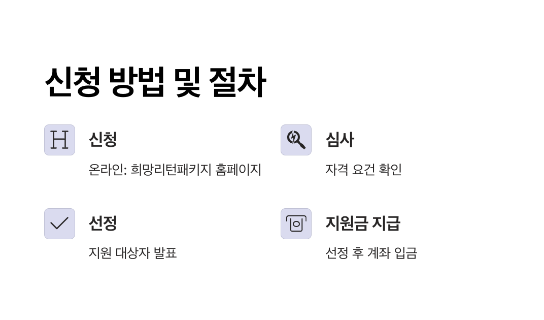 - 희망리턴패키지와 재도전 장려금은 교육·훈련 시작 전 또는 시작 후 1개월 이내에 신청해야 지원금이 지급됩니다.