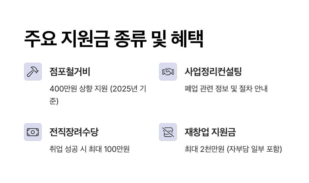이처럼 2025년 폐업 소상공인 지원금은 크게 점포철거비, 재기지원, 전직장려수당, 재도전 장려금 등 네 가지 주요 항목으로 나뉩니다. 지원금별로 신청 자격과 지급 방식이 다르므로, 본문에서 구체적인 조건과 절차를 하나씩 살펴보시면 어렵지 않게 이해하고 신청하실 수 있습니다.