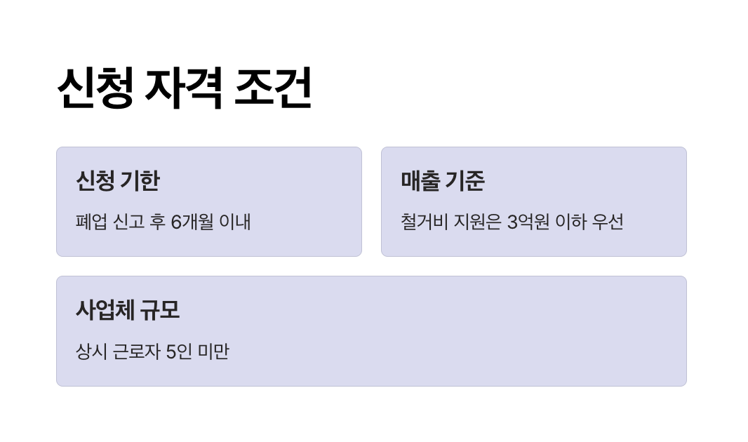 - 필수 서류: 철거업체 견적서, 철거 완료 영수증, 사업자등록 폐업 증명서, 통장 사본.