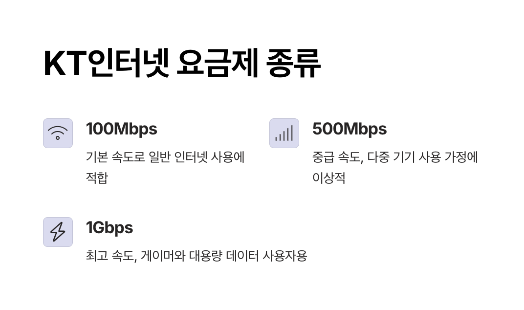 2025년 기준 KT인터넷 요금제는 사용자의 인터넷 사용 패턴과 예산에 따라 선택할 수 있도록 총 3~4가지 주요 요금제로 나뉘어 있습니다.