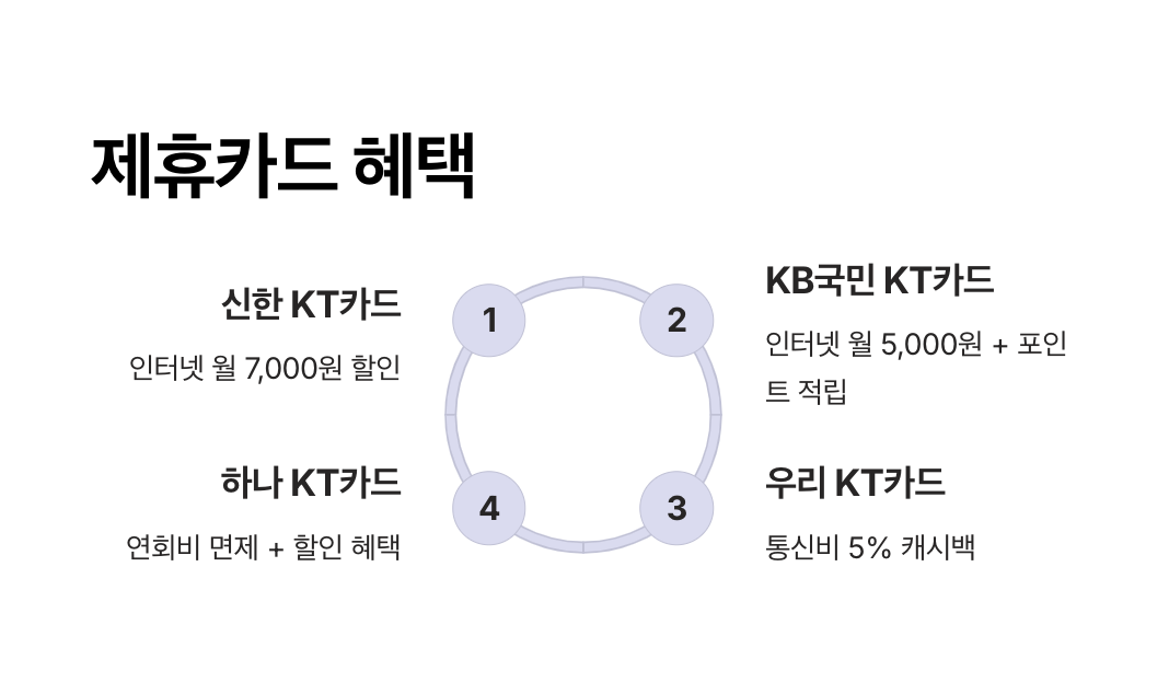 - 대표 카드: 하나 KT Super Card, 국민 KT통신비할인카드 등