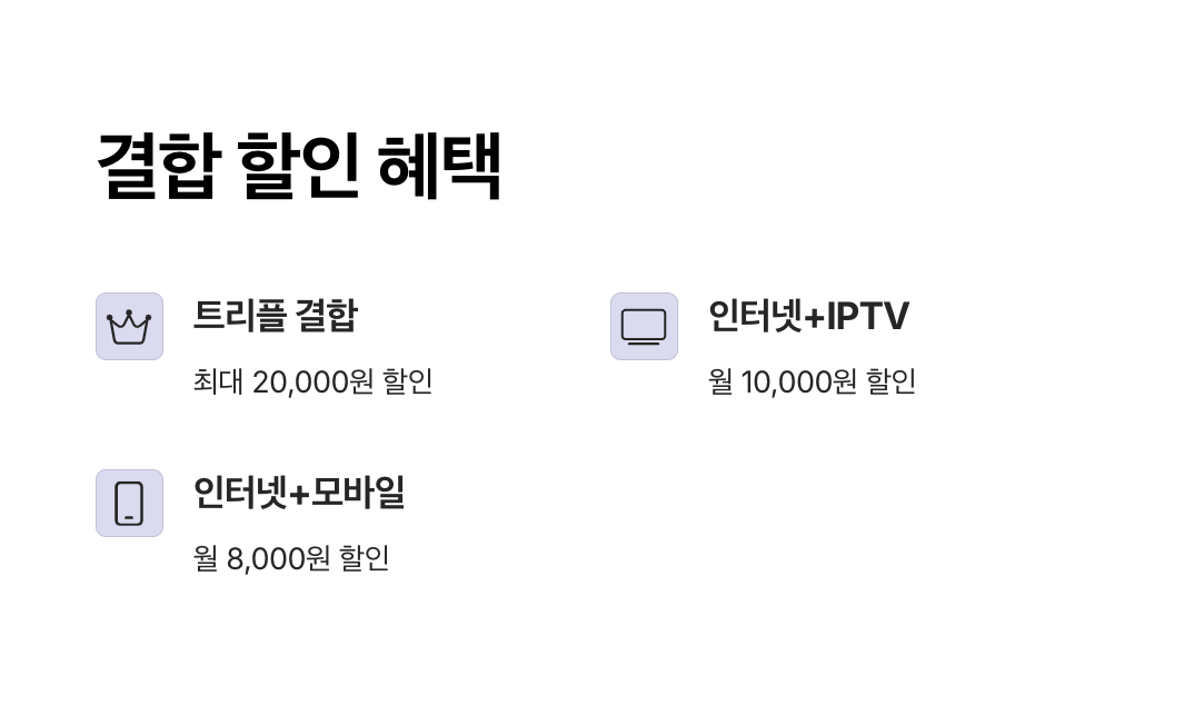 ※ 결합 할인은 KT 모바일(핸드폰), 가족결합, IPTV 묶음 등으로 적용 가능하며, 조건에 따라 차등 적용됩니다.