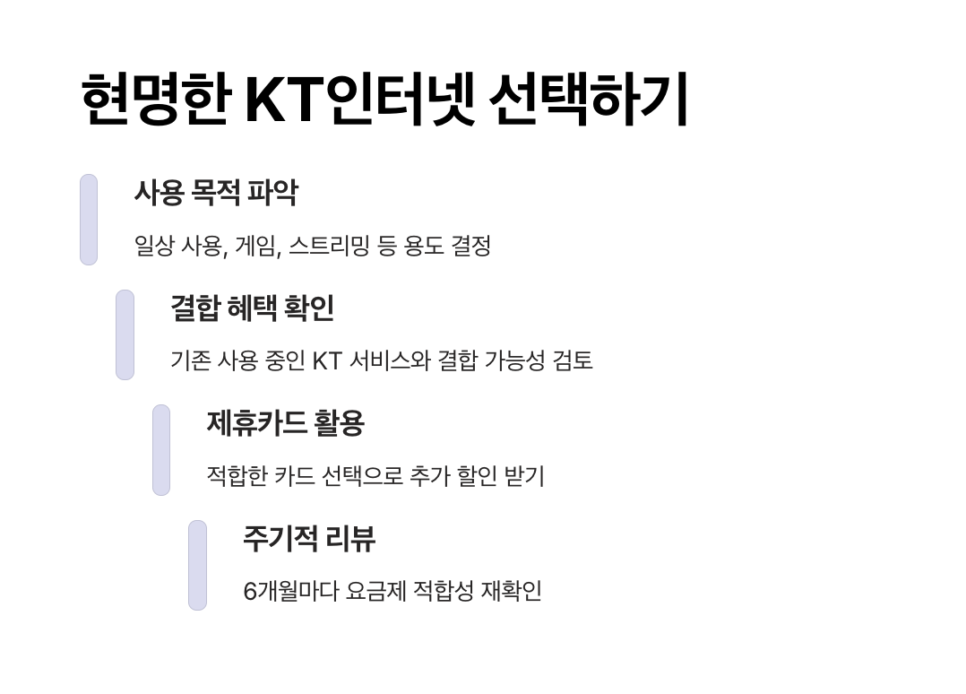 특히, KT인터넷 요금제 비교는 속도와 가격뿐 아니라 결합 할인, 사은품, 제휴카드 혜택까지 함께 따져야 더 큰 혜택을 누릴 수 있습니다.