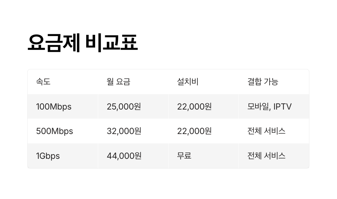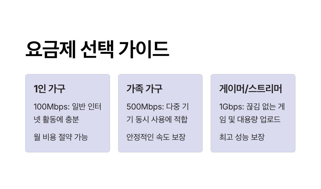 - 인터넷 속도별 요금이 다름: 100Mbps와 1Gbps는 요금 차이뿐 아니라 체감 속도도 크게 다릅니다.