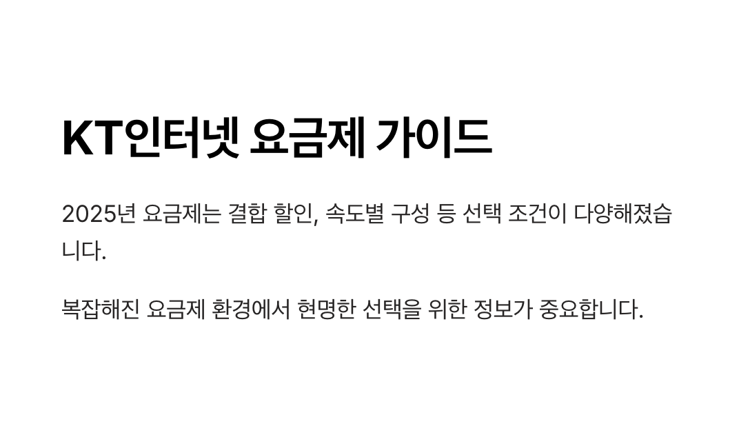 KT인터넷 요금제는 단순히 속도만 보고 선택하기보다는, 가구 형태, 이용 목적, 결합 가능 여부, 예산 등을 함께 고려해야 현명한 선택이 가능합니다.