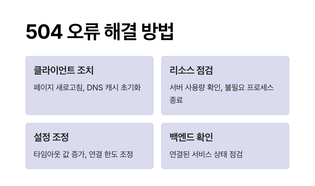 - Nginx, Apache 같은 웹서버 또는 AWS, GCP 같은 클라우드 환경에서 기본 타임아웃 설정이 짧을 경우 504 오류가 발생할 수 있습니다.