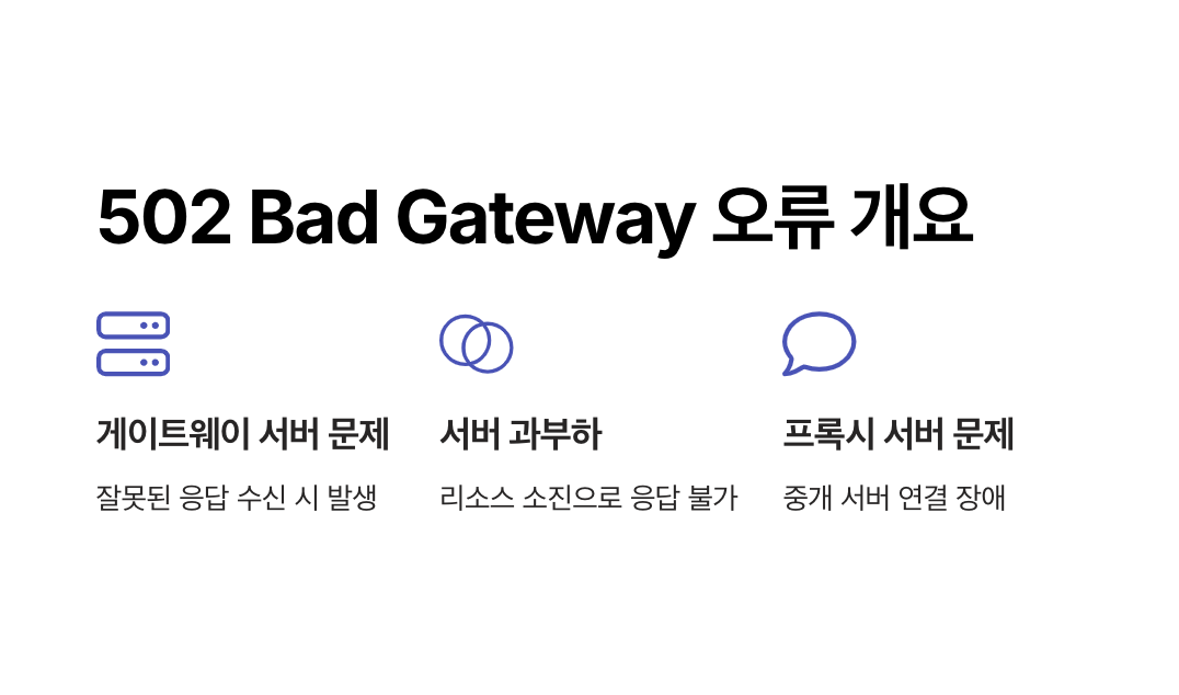 502 Bad Gateway 오류는 게이트웨이 또는 프록시 서버가 상위 서버로부터 잘못된 응답을 받을 때 발생하는 오류입니다. 웹사이트 방문 시 서버 간 네트워크 통신 문제로 인해 발생하며, 사용자는 정상적인 웹페이지를 볼 수 없습니다.