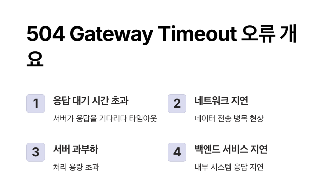 504 Gateway Timeout 오류는 게이트웨이 또는 프록시 서버가 원본 서버로부터의 응답을 기다리다가 시간 초과가 발생했을 때 나타나는 오류입니다.