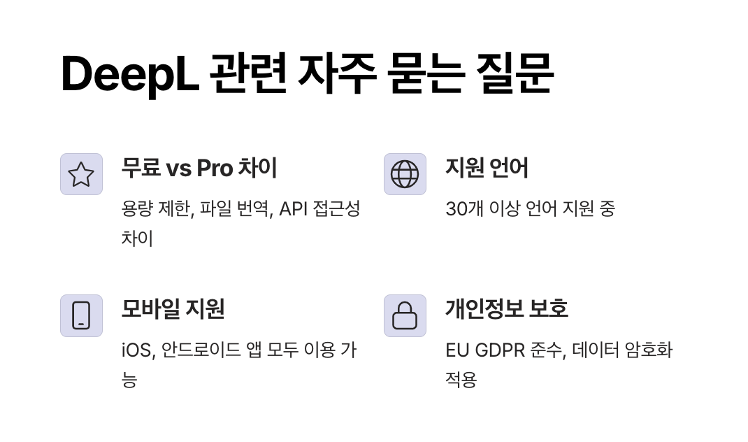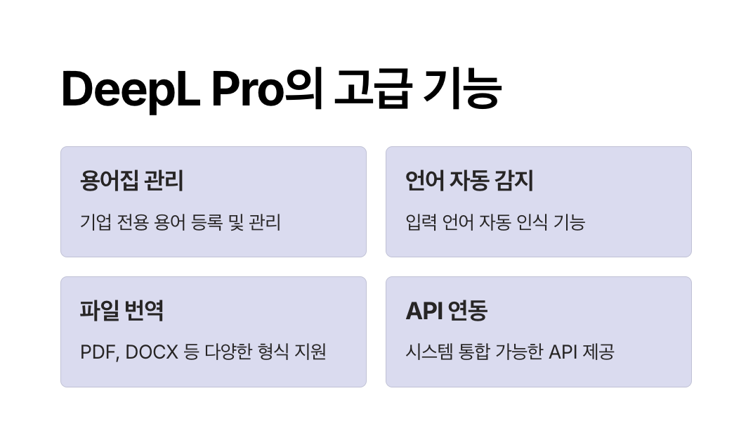 - A. DeepL Pro는 광고 없이 고속 번역이 가능하며, 용어집(사용자 정의 사전) 기능과 파일 업로드 번역, 문체 조절(격식/비격식) 등의 고급 기능을 제공합니다.
