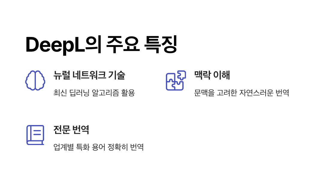 딥러닝 기술을 기반으로 문맥과 의미를 이해하고, 더 자연스럽고 사람 같은 번역문을 제공하는 것이 특징입니다.