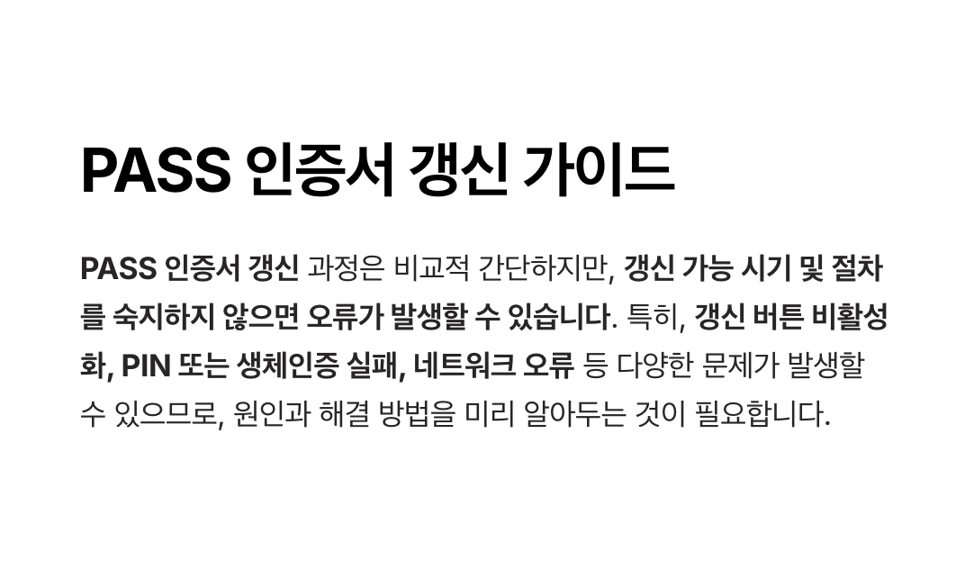 PASS 인증서 갱신 과정에서 발생할 수 있는 대표적인 오류와 해결 방법을 정리했습니다.