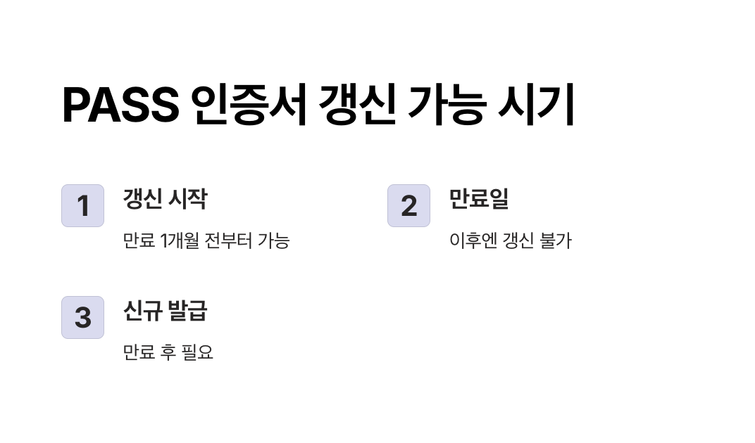 PASS 인증서 갱신은 유효기간 만료 1개월 전부터 가능하며, 간단한 인증 과정을 거쳐 연장할 수 있습니다. 만약 유효기간이 이미 만료된 경우, 갱신이 불가능하므로 신규 발급 절차를 진행해야 합니다.