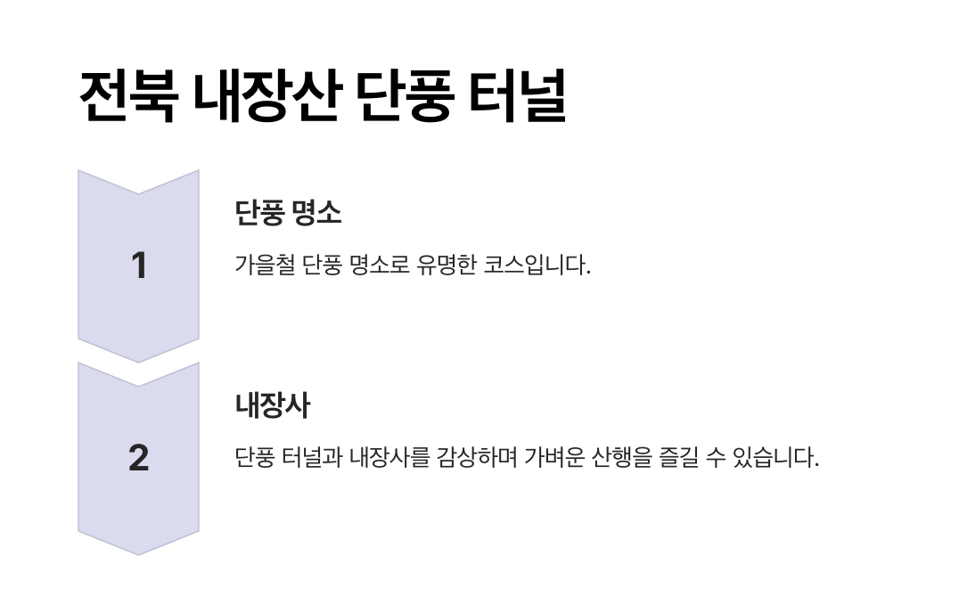 - 주요 포인트: 단풍 터널, 내장사 사찰.