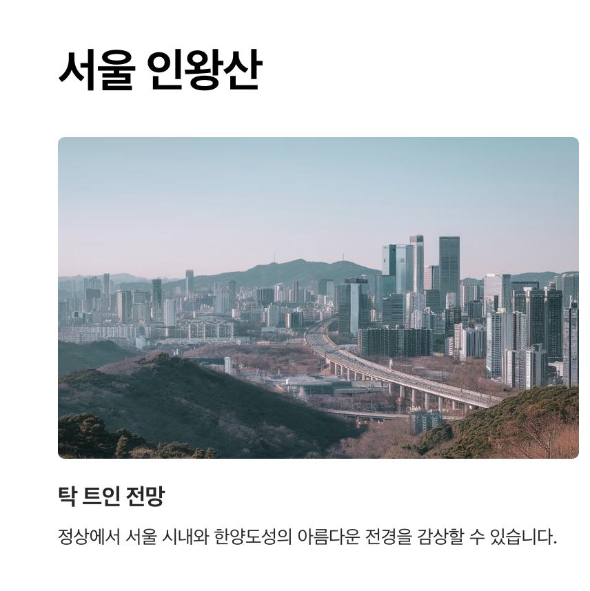 - 주요 포인트: 정상에서 서울 도심과 한양도성의 전경을 감상할 수 있음.